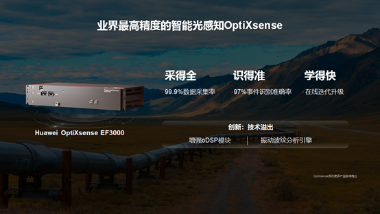 油氣管線作為國家能源輸送的大動脈,隨著管線里程的增長,“人工+自動‘’的新巡線方式已成為迫切需求。華為將領先的光技術應用于光纖傳感領域,打造了全新的智能光感知產品系列Huawei OptiXsense。這款產品是目前業(yè)界識別準確率領先的光纖振動傳感產品,將廣泛應用于油氣管線場景,其具有采得全、識得準、學得快的優(yōu)勢,該新品由三大核心技術支撐: