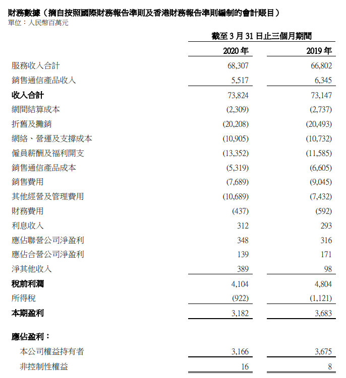 2020年第一季度,產(chǎn)業(yè)互聯(lián)網(wǎng)業(yè)務(wù)收入為人民幣114.48億元,比去年同期上升32.2%。得益于創(chuàng)新業(yè)務(wù)快速增長拉動,固網(wǎng)服務(wù)收入達(dá)到人民幣298.94億元,比去年同期上升11.1%。整體服務(wù)收入為人民幣683.07億元,比去年同期上升2.3%。2020年第一季度,網(wǎng)間結(jié)算成本比去年同期下降15.6%,主要受網(wǎng)間話務(wù)量下滑影響。折舊及攤銷比去年同期下降1.4%,主要得益于近年資本開支的良好管控。網(wǎng)絡(luò)、營運(yùn)及支撐成本比去年同期上升1.6%,主要由于網(wǎng)絡(luò)規(guī)模擴(kuò)大導(dǎo)致期內(nèi)鐵塔使用費(fèi)增加。