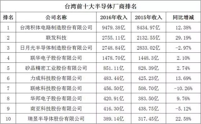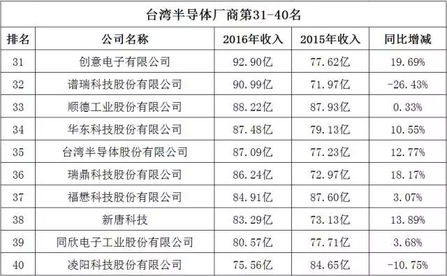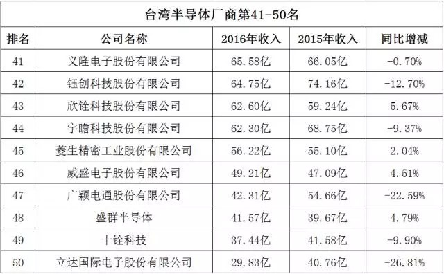 2016年臺灣上市半導(dǎo)體公司營收TOP 50