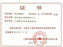 據(jù)了解,上海拜安科技有限公司采用多項(xiàng)核心專利技術(shù)研發(fā)生產(chǎn)的新型光纖放大器產(chǎn)品獲得上海市高新技術(shù)成果轉(zhuǎn)化認(rèn)證,標(biāo)志著拜安科技光纖放大器產(chǎn)品在技術(shù)創(chuàng)新上達(dá)到了一個(gè)新的高度。