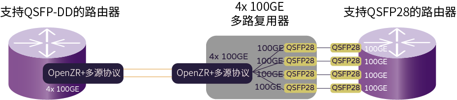 在所有路由器尚未遷移到400GE的運(yùn)營(yíng)商網(wǎng)絡(luò)中,在OpenZR+光模塊中部署4x100GE多路復(fù)用非常有價(jià)值。這種4x100GE模式可以讓支持400GE功能的路由器和具有100GE功能的路由器互通。采用這種布局的例子如下所示。承載400G OpenZR+光模塊的4x100GE多路復(fù)用器可以將路由器上的400G OpenZR+接口分支連接到遠(yuǎn)端路由器上的4個(gè)100GE QSFP28端口。