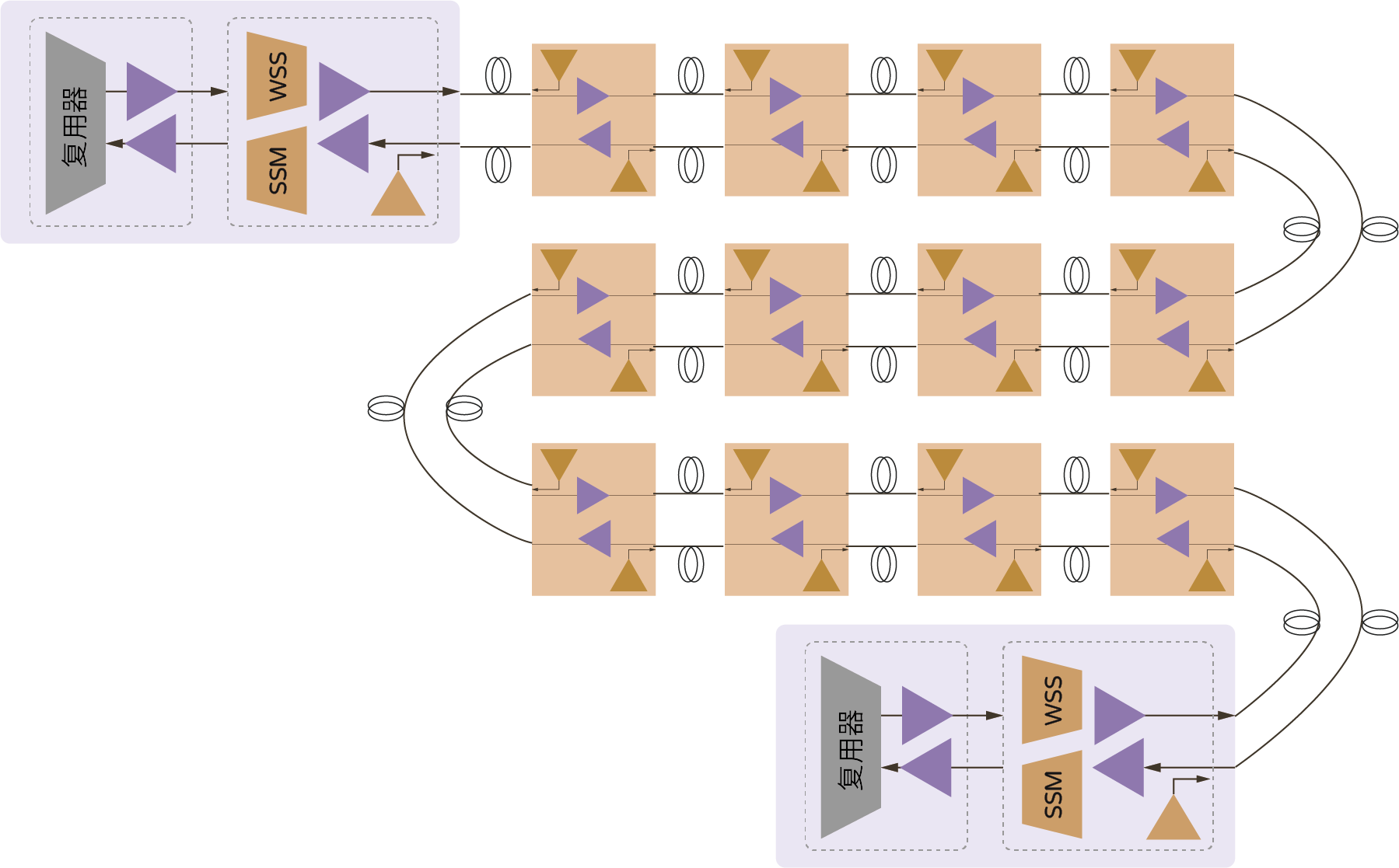 在長(zhǎng)距離傳輸應(yīng)用中,大多數(shù)線路系統(tǒng)都使用可重新配置的光分插復(fù)用器(Flex-grid ROADM)以Nx6.25GHz的增量實(shí)現(xiàn)信道規(guī)劃的靈活性,并采用EDFA和反向傳播拉曼放大器的混合配置來(lái)最大化鏈路的OSNR。