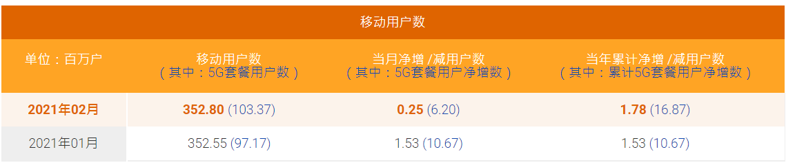 數(shù)據(jù)顯示,中國電信2月移動用戶數(shù)凈增25萬戶,用戶總數(shù)達(dá)到3.5280億戶。中國電信5G套餐用戶數(shù)2月凈增620萬戶,累計達(dá)到1.037億戶。