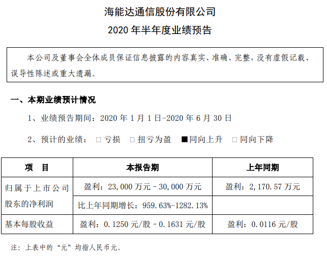 ICC訊 (編輯:Nicole)海能達通信股份有限公司(以下簡稱:海能達)發(fā)布2020 年半年度業(yè)績預告:預計2020年上半年度業(yè)績同向上升,歸屬于上市公司股東的凈利潤23,000 萬元–30,000 萬元,同比增長959.63%-1282.13%,上年同期實現(xiàn)盈利2,170.57 萬元。