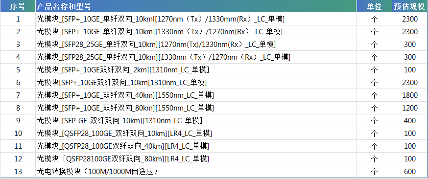 根據(jù)公告,此次集采擬采購13種型號光模塊產(chǎn)品,合計數(shù)量約為11830個,涉及產(chǎn)品型號及預估規(guī)模如下表,最終采購數(shù)量以招標人實際下達的采購訂單為準。采購預算為230.9萬元(不含稅)。