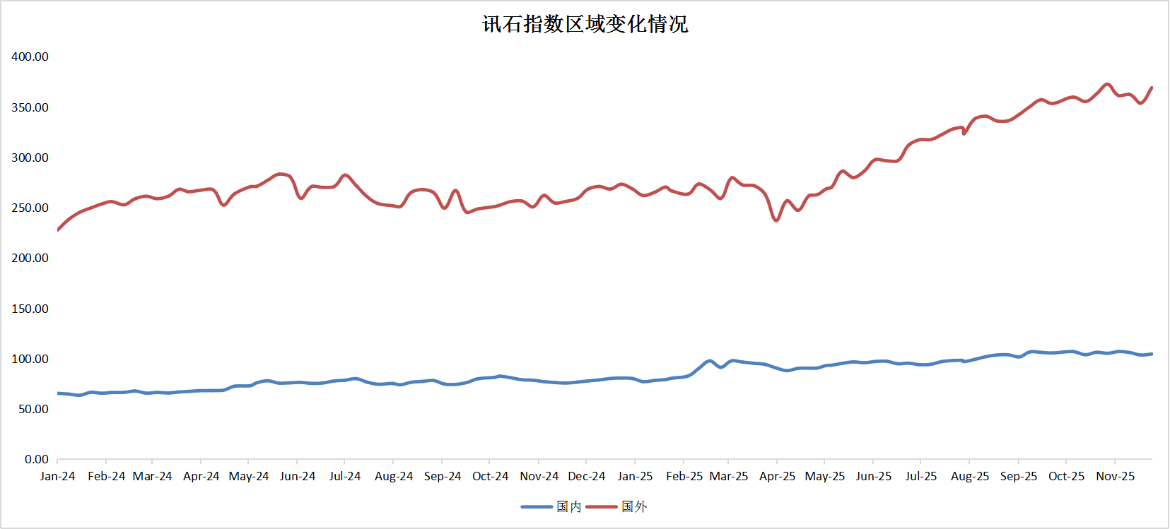 按地區(qū)劃分,截止到11月28日,ICC所統(tǒng)計的國內(nèi)通信指數(shù)為104.41,環(huán)比略微下滑。國外通信指數(shù)為369.05,較上月下滑0.95%。國外股指在波折中,呈現(xiàn)向上增長的趨勢。