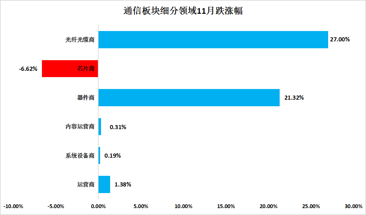 ICC訊 2025年11月訊石通信股指環(huán)比下滑3.05%。市場呈現(xiàn)向回落趨勢。11月光纖光纜和器件商板塊增長亮眼,芯片商環(huán)比下滑6.62%,其他板塊增長幅度較小。增長幅度最大的是光纖光纜商,環(huán)比增長了27%,其次是器件商,環(huán)比增長了21.32%。