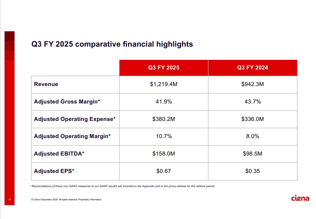 2025財年第三季度,Ciena營收為12.19億美元,去年同期為9.42億美元,同比增長29.4%。2025財年第三季度毛利率為41.3%,去年同期為42.9%,同比下滑1.6%。2025財年三季度凈收入5030萬美元,每股收益0.35美元,去年同期凈收入1420萬美元,每股收益0.1美元。2025財年第三季度,訂單再創(chuàng)紀(jì)錄,訂單額遠超收入,為2025財年17%增長及2026財年同樣增速預(yù)告奠定基礎(chǔ)。