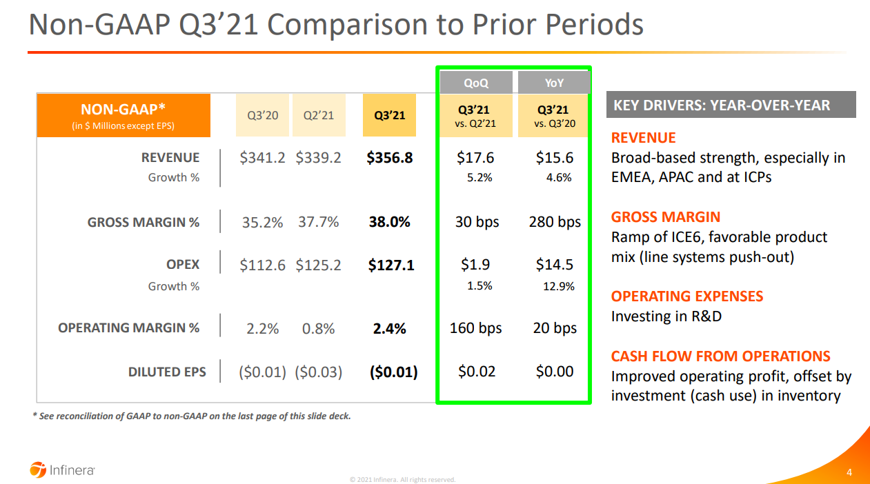 2021年第三季度,Infinera非 GAAP銷售收入3.57億美元,上個季度3.39億美元,去年同期3.41億美元。非GAAP毛利率38%,上個季度37.7%,去年同期35.2%。非GAAP凈虧損300萬美元,或每股虧損1美分;上個季度非GAAP凈虧損600萬美元,或每股虧損3美分;去年同期非GAAP凈虧損80萬美元,或每股虧損1美分。
