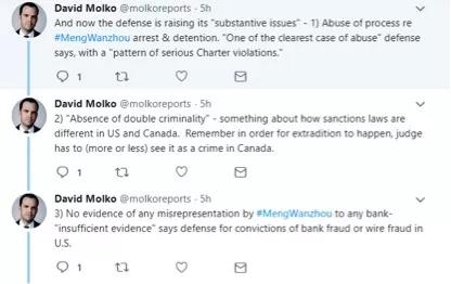 另?yè)?jù)環(huán)球時(shí)報(bào)微信消息,華為公司在聲明中提到的這些辯護(hù)信息,也得到了今天凌晨參加聽(tīng)證會(huì)的多名加拿大記者的證實(shí)。這些加拿大記者在自己的社交賬號(hào)上也發(fā)布了這些辯護(hù)的信息: