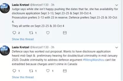 孟晚舟律師團(tuán)隊(duì)表示,他們將向檢察官申請(qǐng)額外的案件披露信息,包括孟晚舟在機(jī)場(chǎng)被捕的相關(guān)信息。最終,法官?zèng)Q定在9月23日到10月4日之間孟晚舟再次聽(tīng)證,這將是披露申請(qǐng)聽(tīng)證會(huì)。
