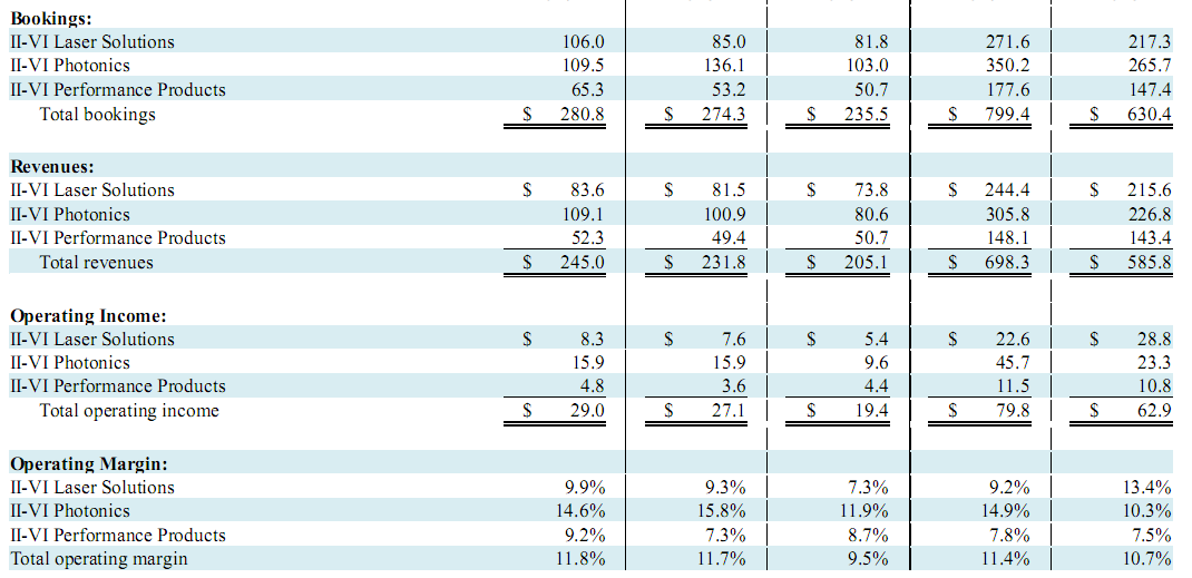 II-VI三大業(yè)務(wù)部門業(yè)績(jī)對(duì)比