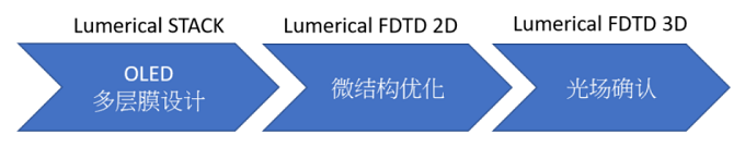 本案例利用 ANSYS Lumerical 將結(jié)構(gòu)從一維到三維逐步優(yōu)化。針對(duì) OLED 基本多層膜結(jié)構(gòu),以 FDTD 搭配矩陣光學(xué)的 STACK 模塊,快速地對(duì)多層膜的干涉與微腔效應(yīng)進(jìn)行頻譜與基礎(chǔ)場(chǎng)型的設(shè)計(jì)。接著以 FDTD 2D 掃描微結(jié)構(gòu)參數(shù)和偶極子位置來優(yōu)化提取效率。最后再以 FDTD 3D 模擬 OLED 形成數(shù)組排列時(shí),怎么以對(duì)稱性來減少內(nèi)存需求與仿真時(shí)間,給出最后驗(yàn)證、需要輸出給幾光軟件的光型數(shù)據(jù)。