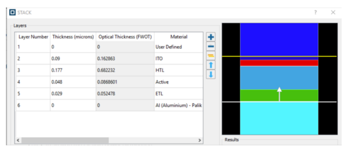 OLED 基本結(jié)構(gòu)是平面堆棧多層膜,比起計(jì)算馬克是威爾方程,解析解能快速準(zhǔn)確地給出答案。在 Ansys Lumerical 的 STACK 界面下,建模僅需輸入(或從數(shù)據(jù)庫(kù)選取)材料折射率參數(shù)與膜層厚度,指定偶極子所在的位置、頻譜信息等就完成了。常見 6-8 層的堆棧都可以在 1 秒左右得到一個(gè)條件的結(jié)果。配合使用界面的條件掃描,可對(duì)模層厚度快速找到適合的組配。