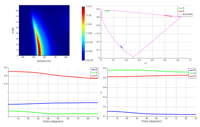 STACK 使用界面有許多搭配好的腳本函數(shù),比如可以用 stackfield 函數(shù)觀察目前膜厚設(shè)計(jì)對(duì)模擬波長(zhǎng)范圍內(nèi)的響應(yīng),進(jìn)而調(diào)整到最佳設(shè)計(jì)。Stackpurcell 函數(shù)則可以協(xié)助算出遠(yuǎn)場(chǎng)的場(chǎng)型。此外也有計(jì)算三色刺激值等等函數(shù),上面幾個(gè)函數(shù)對(duì)顯示器或照明的應(yīng)用十分方便。比如圖示為針對(duì)綠光畫素設(shè)計(jì)的 OLED 頻譜與角度響應(yīng),以及如果有發(fā)光層光源的頻譜信息就能計(jì)算出對(duì)應(yīng)的色坐標(biāo)(x,y),也能計(jì)算隨角度的色偏 (u’v’)表現(xiàn)。