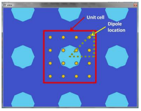 顯示或照明的應(yīng)用上,常需要讓 OLED 有特定排列,有時(shí)在前面提及的非同調(diào)以及采樣需求之外有更多條件要模擬造成內(nèi)存或時(shí)間負(fù)擔(dān),因此靠對(duì)稱性省去一些模擬次數(shù)是必要的技巧。以四角排列為例,如在一個(gè) OLED 單元中 4*4 個(gè)偶極子位置是足夠的取樣數(shù)量,而每一偶極子要有三個(gè)震蕩方向,共 3*16=48 個(gè)條件。但考慮對(duì)稱性后,僅需模擬虛線三角形內(nèi)的三個(gè)偶極子,且在矩形對(duì)角線的偶極子震蕩方向 x 與 y 方向都與對(duì)角線夾 45 度因此可以僅模擬其中一個(gè),最后剩下對(duì)角線兩偶極子模擬 x 與 z 震蕩,加上三角形內(nèi)另一偶極子三方向震蕩,剩下 7 個(gè)條件。在掃描條件中把這 7 個(gè)條件依面積比例設(shè)定要計(jì)算回最后完整單元的權(quán)重。借助腳本,在 Lumerical 接口下在如此復(fù)雜的架構(gòu)下也可以看到最后的場(chǎng)型。