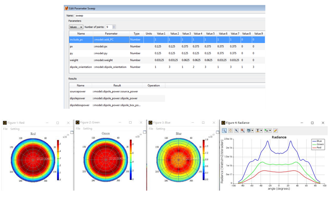 以本結(jié)構(gòu)為例,原本膜層僅適合寬光型藍(lán)色應(yīng)用,增加結(jié)構(gòu)之后藍(lán)色頻譜較原本集光、效率與原本接近,而綠色與紅色波段則變非常準(zhǔn)直、效率明顯提升。在此階段 Lumerical 提供適合各種應(yīng)用的探測(cè)器,一個(gè)按鍵就能得到需要的結(jié)果。