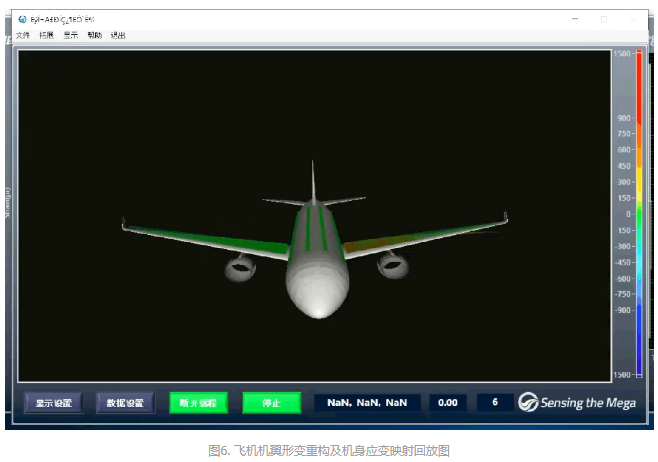 形變重構(gòu):圖6為飛機(jī)機(jī)翼形變重構(gòu)及應(yīng)變映射回放圖,在機(jī)翼上布設(shè)多段光纖,即可將光纖測(cè)試數(shù)據(jù)轉(zhuǎn)換為形變并在三維重構(gòu)軟件中顯示,讓“數(shù)據(jù)變化”轉(zhuǎn)化為“可視形變”。并可與其它類(lèi)型的線形組合使用。