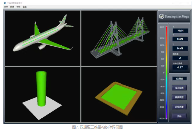 多通道數(shù)據(jù)融合:圖7為四通道三維重構(gòu)軟件,軟件支持多通道光纖數(shù)據(jù)同步展示,即同時(shí)將多組數(shù)據(jù)映射到多個(gè)3D模型,實(shí)現(xiàn)不同試驗(yàn)件的三維應(yīng)變場(chǎng)對(duì)比分析。