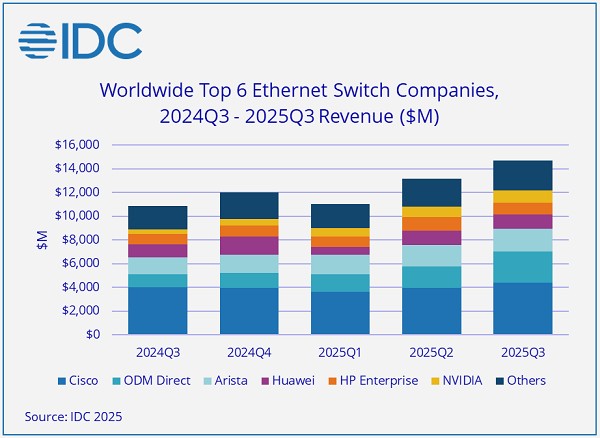 ICC訊 —— 國際數(shù)據(jù)公司(IDC)最新發(fā)布的《季度以太網(wǎng)交換機跟蹤報告》和《季度路由器跟蹤報告》顯示,2025年第三季度(3Q25),全球以太網(wǎng)交換機市場收入達到147億美元,較去年同期增長35.2%。這一強勁增長主要由市場的數(shù)據(jù)中心部分驅(qū)動,因為超大規(guī)模企業(yè)和云服務(wù)提供商競相為AI時代構(gòu)建基礎(chǔ)設(shè)施容量。與此同時,2025年第三季度全球企業(yè)和服務(wù)提供商(SP)路由器市場總額同比增長15.8%,達到36億美元。