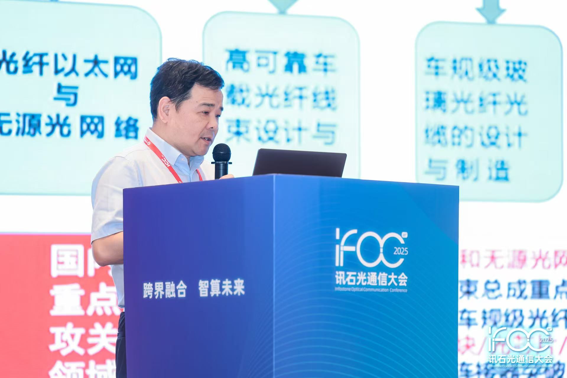 烽火通信技術(shù)研究中心總經(jīng)理羅文勇則在《車載光通信技術(shù)發(fā)展與展望》中,直面車載通信網(wǎng)絡(luò)的升級(jí)需求與中國(guó)產(chǎn)業(yè)機(jī)遇。他指出,智能網(wǎng)聯(lián)汽車的快速演進(jìn)使傳統(tǒng)銅纜在帶寬、重量、成本上的瓶頸日益凸顯,車載光纖通信成為破局關(guān)鍵;依托國(guó)內(nèi)光纖到戶的產(chǎn)業(yè)規(guī)模與技術(shù)優(yōu)勢(shì),發(fā)展車載PON、推進(jìn)以V-PON為核心的“光進(jìn)銅退”方案具有重要現(xiàn)實(shí)意義。同時(shí),他還提出V-PON技術(shù)需突破車規(guī)級(jí)無源器件、光芯片研發(fā)等關(guān)鍵領(lǐng)域,并建議加強(qiáng)跨領(lǐng)域協(xié)作與標(biāo)準(zhǔn)統(tǒng)一。此外,其還分享了中國(guó)信科集團(tuán)的全棧技術(shù)布局,以及烽火通信聯(lián)合光迅、信科智聯(lián)等企業(yè)構(gòu)建“光-芯-網(wǎng)-端”生態(tài)的進(jìn)展,包括國(guó)內(nèi)首款Risc-V車規(guī)MCU芯片與車載PON系統(tǒng)原型的推出,凸顯中國(guó)企業(yè)在該領(lǐng)域的技術(shù)實(shí)力。