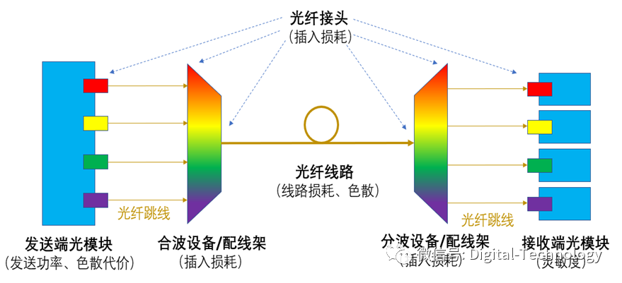 合分波或配線架插入損耗:對于采用波分復(fù)用的通信系統(tǒng),在通信鏈路上可能會使用合波設(shè)備把多個波長合路到一個光纖上,在接收端再通過分波設(shè)備把各個波長分配提取出來,甚至中間鏈路上可能還會有專門的WSS(波長選擇開關(guān))控制各個波長信號的路由和切換。另外,在很多機(jī)房中還會使用光纖配線架實現(xiàn)終端設(shè)備和干線光纜的跳接。合分波設(shè)備和配線架都會造成光信號的功率損耗,具體的損耗和使用的設(shè)備類型及實現(xiàn)原理有關(guān)。