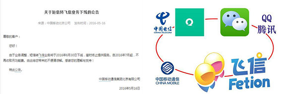 Iccsz訊 近日,中國(guó)移動(dòng)在其官網(wǎng)上發(fā)布了《關(guān)于短信轉(zhuǎn)飛信業(yè)務(wù)下線的公告》,公告中稱由于業(yè)務(wù)調(diào)整,短信轉(zhuǎn)飛信業(yè)務(wù)將于2016年6月30日下線,屆時(shí)將終止提供服務(wù)。有媒體對(duì)此解讀為“飛信已死”,并在互聯(lián)網(wǎng)上廣泛傳播。
