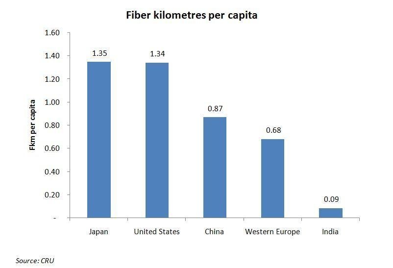 在對幾大表現(xiàn)極佳的電信市場光纜部署情況進行比較之后發(fā)現(xiàn),印度人均光纖公里數(shù)(fkm)明顯低于其他國家和地區(qū)主要市場。例如,擁有13億人口的中國人均fkm是0.87,而擁有12億人口的印度fkm只有0.09(即中國的十分之一)。在發(fā)達市場,如美國和日本等,平均分數(shù)在1.3及以上(見下圖)。