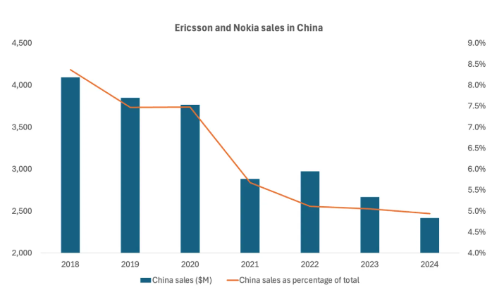 然而五年后,翻開(kāi)愛(ài)立信的財(cái)報(bào),幾乎以為換了一家公司:到2024年,中國(guó)收入占比已萎縮至4%,銷售額僅略高于10億美元;印度取而代之,成為第二大國(guó)家市場(chǎng)。截至今年第三季度,中國(guó)收入占比進(jìn)一步跌至3%。與此同時(shí),愛(ài)立信對(duì)美國(guó)市場(chǎng)的依賴達(dá)到史無(wú)前例的高度——今年前九個(gè)月,43% 的收入來(lái)自美國(guó)客戶。