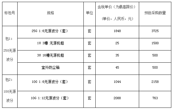 ICC訊 (編輯:Nicole) 北京移動(dòng)啟動(dòng)2021年無(wú)源波分項(xiàng)目(招標(biāo)編號(hào):YD01HW12210008 ),擬采購(gòu)無(wú)源波分設(shè)備共6646套,包括25G 1:6無(wú)源波分3725套,10G 1:6無(wú)源波分2158套,10G 1:12無(wú)源波分763套,另需采購(gòu)無(wú)源光纖復(fù)用設(shè)備配件2500套。
