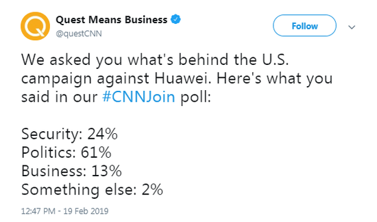 CNN電視臺Quest Means Business節(jié)目官方推特昨日播出了最新的調(diào)查結(jié)果:61%美國群眾認為美國打壓華為是政治原因。僅24%的群眾認為是出于安全考慮,13%群眾認為是商業(yè)原因。