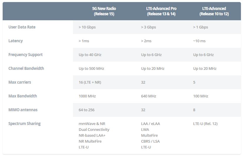 如前所述,網(wǎng)絡(luò)技術(shù)的范圍也大大增加。LTE在過(guò)去幾年里經(jīng)歷了許多改進(jìn)。從引入256QAM和LTE-A載波聚合,到支持通過(guò)LAA、LWA和Multefire與LTE-A Pro更廣泛地使用未經(jīng)許可的頻譜。這就是為什么今天的4G網(wǎng)絡(luò)比多年前最初推出時(shí)快得多。5G技術(shù)又向前邁進(jìn)了一步,要求使用256QAM并改進(jìn)載波聚合技術(shù),以支持更靈活的未授權(quán)頻譜、低于6GHZ和 mmWave頻率的載波波段。下面這張 Arm 公司2016年的圖片簡(jiǎn)明扼要地解釋了這種核心差異。