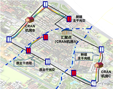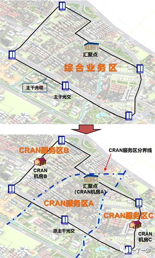 為避免接入光纜的重復(fù)建設(shè)、便于網(wǎng)絡(luò)規(guī)劃建設(shè)和運(yùn)維管理,一般要求5G前傳(從C-RAN機(jī)房到基站的傳輸)應(yīng)與綜合業(yè)務(wù)區(qū)內(nèi)的寬帶、專線等業(yè)務(wù)用一張光纜網(wǎng)進(jìn)行承載。而綜合業(yè)務(wù)區(qū)光纜是按微網(wǎng)格進(jìn)行分片覆蓋的,如此一來,1個(gè)綜合業(yè)務(wù)區(qū)就分裂成2-3個(gè)C-RAN服務(wù)區(qū)。