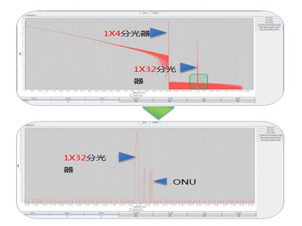 下圖為日海COTDR的樣機(jī)測(cè)試波形圖,模擬線路采用了兩級(jí)分光,1X4為一級(jí)分光,1X32為二級(jí)分光。