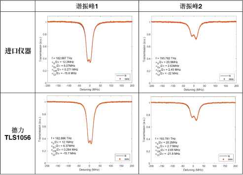 宏觀數(shù)據(jù)的一致性至關重要,但微觀細節(jié)更能考驗設備的性能。深國量院集成光學研究團隊進一步對比了所有諧振峰的透射譜線型。下圖展示了其中幾個具有代表性的諧振峰對比情況,可以清晰地看到,無論是諧振點的波長定位、譜線的深度與寬度,還是對稱性,TLS1056所測得的結果都與領先進口儀器的輸出保持了高度一致。這種在細微之處的一致性,充分證明了德力TLS1056激光器出色的光譜純度和掃頻穩(wěn)定性。