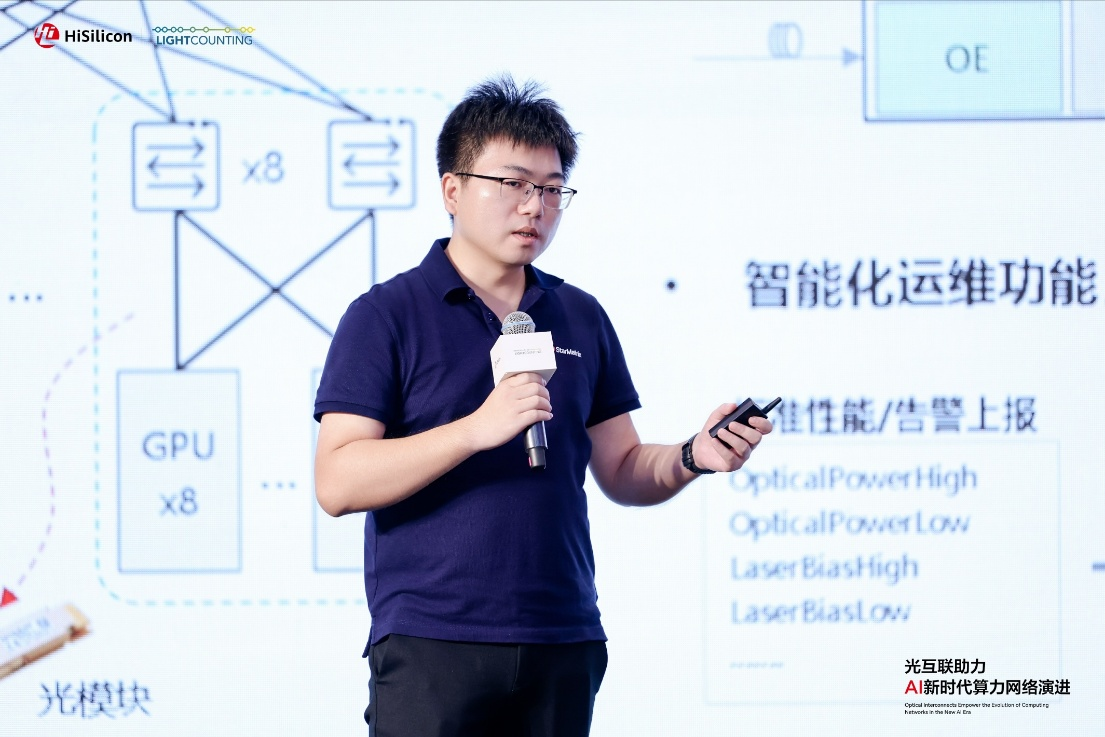 來自海思光電子有限公司的資深產(chǎn)品規(guī)劃經(jīng)理侯康受邀發(fā)表了《AI智算時代集群光互聯(lián)解決方案探討》的主題報告并發(fā)布面向智算場景的星云StarMatrix光互聯(lián)解決方案。報告說明,隨著AI應(yīng)用的逐步落地及新型大模型的持續(xù)迭代,算力需求爆發(fā)增長,算力架構(gòu)也由單卡模式、單機模式等快速向大規(guī)模集群演進切換,全光互聯(lián)成為大規(guī)模智算集群中Scale Up和 Scale Out網(wǎng)絡(luò)發(fā)展的關(guān)鍵路徑。