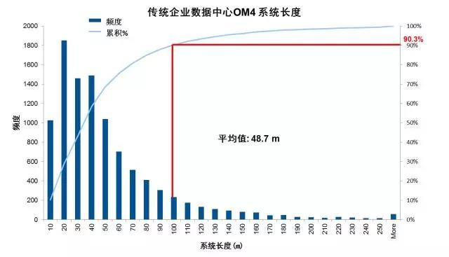 圖1. 傳統(tǒng)企業(yè)數(shù)據(jù)中心OM4系統(tǒng)長度分布圖