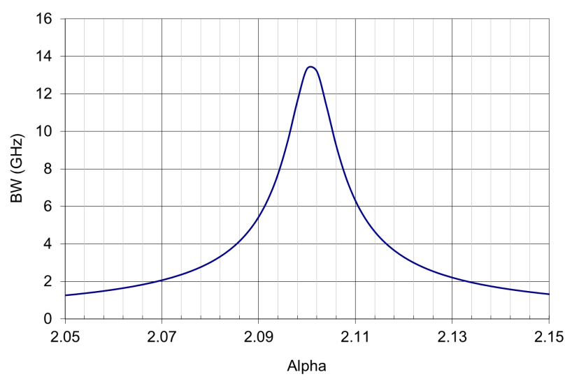 選擇合適的a值,多模光纖的模式帶寬可以在一定波長范圍內(nèi)進(jìn)行優(yōu)化。圖3為50 μm多模光纖在850 nm波長a值變化1%時(shí)的帶寬分布,光纖的a值在最佳位置時(shí),帶寬值超過13 GHz.km。該圖也反映出多模光纖的帶寬對(duì)a值非常敏感,如實(shí)現(xiàn)最大的帶寬,需要對(duì)a值(纖芯折射率)進(jìn)行非常精細(xì)的控制,否則纖芯剖面在制造過程中的各種缺陷會(huì)影響多模光纖的實(shí)際帶寬。