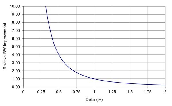 纖芯的最大相對(duì)折射率?0對(duì)最大帶寬也有影響。因?yàn)閹捙c1/?2成正比,如圖4所示當(dāng)纖芯?0從1%降至0.75%時(shí),帶寬將會(huì)加倍。但降低纖芯?0會(huì)加大彎曲損耗,需要通過優(yōu)化光纖結(jié)構(gòu)設(shè)計(jì)來改善其彎曲性能。