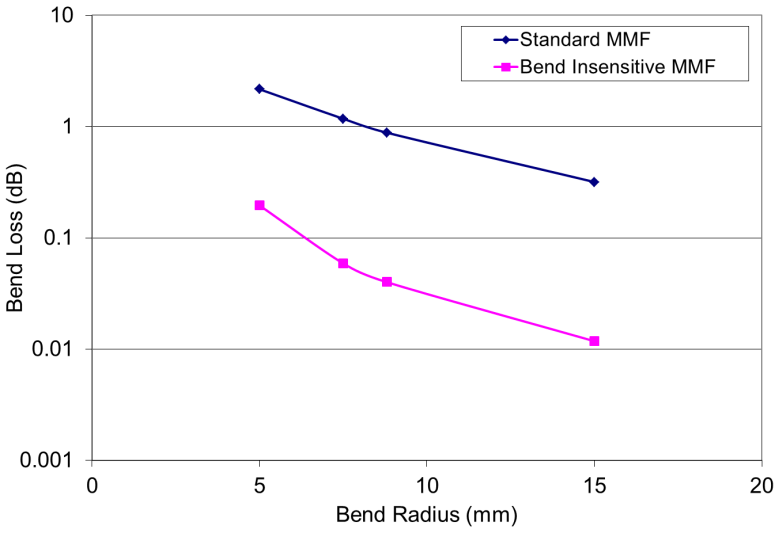 圖6 標(biāo)準(zhǔn)和彎曲不敏感多模光纖的彎曲損耗對(duì)比