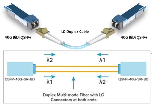目前市場上有兩種基于多波長復(fù)用技術(shù)的產(chǎn)品。一種是BiDi(Bi-direction)技術(shù),如下圖(以40G為例)所示,光模塊有兩個(gè)20 Gbps的雙向通道,每根光纖都具有發(fā)送和接收功能(多模光纖支持850nm和900nm兩個(gè)波長),最終在2根光纖上實(shí)現(xiàn)了40G 傳輸,且無需額外安裝MPT 連接器。值得注意的是,由于BiDi 收發(fā)器的每根光纖既傳輸又接收信號(hào),所以不支持端口分支功能。另一種技術(shù)是短波分復(fù)用(SWDM)技術(shù)。與BiDi 類似, SWDM僅需要一個(gè)兩芯LC 雙工連接,不同的是SWDM 需要工作在850nm 到940nm 之間4 個(gè)不同的波長上,其中一根光纖用于傳輸信號(hào),另一根用于接收信號(hào)。