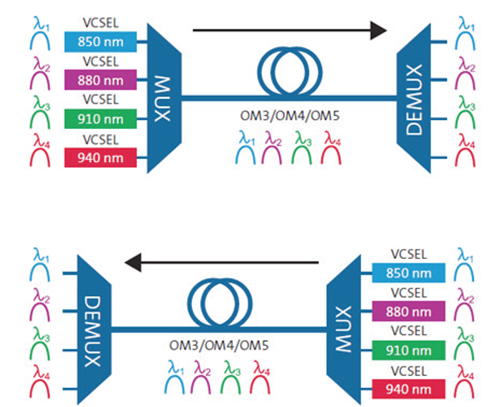 基于IEEE802.3ba制定的40G/100G標(biāo)準(zhǔn),多模光纖40G的傳輸采用每對(duì)光纖支持10Gbps的速率4*10Gbp=40Gbps,需要用到各4根光纖發(fā)送與接收,共8芯光纖,100G采用各4根光纖發(fā)送與接收4*25Gbps=100G,共使用8芯光纖。400 Gb/s傳輸速率需要用到16對(duì)共32芯光纖,這對(duì)于光纖資源的占用非常大。業(yè)界正在探索使用多波長復(fù)用的方式來減少光纖的使用數(shù)量。