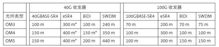 表2:不同光纖類型和收發(fā)器類型的傳輸距離(米)