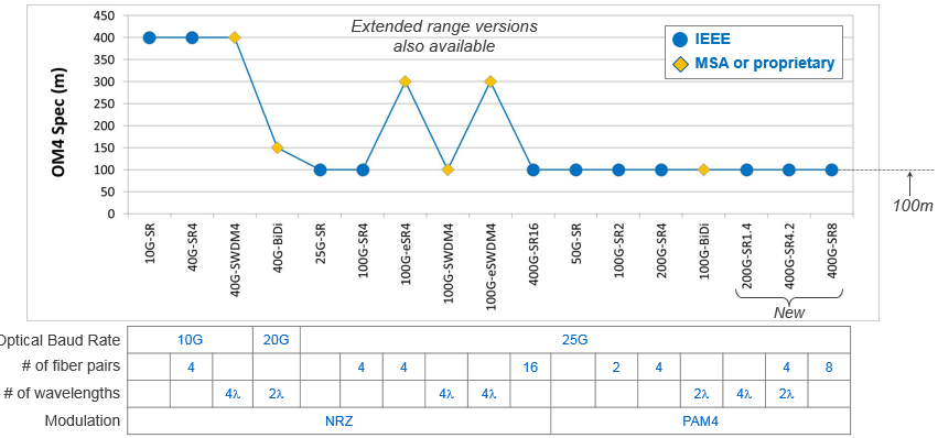 表3比較了不同光纖(OM3/4/5)匹配不同光模塊的傳輸距離。使用OM4 光纖的BiDi 和SWDM 在40G分別能傳輸150m 和350m, 在100G模塊 OM5 可支持 BiDi 和SWDM光模塊150 m 的傳輸,相比之下,OM3和OM4 的傳輸距離為70m 和100 m,但這個(gè)距離對(duì)于大部分多模方案的應(yīng)用場景已經(jīng)足夠。圖10 列出了基于OM4光纖在100米以各種速率下的光模塊解決方案,OM4可以支持從40G演進(jìn)到400G的多種光模塊方案(如100G SR4,100GBiDi,400GSR4.2, 400GSR8等)。在實(shí)際應(yīng)用中,應(yīng)結(jié)合應(yīng)用場景來選擇合適的多模光纖,例如,在需要使用SR4/eSR4 光模塊進(jìn)行端口分支的場景,OM5和OM4性能基本一致 ,因此OM4是更具性價(jià)比的方案,而在 100G或以上速率傳輸距離超過100 m 的鏈路,OM5 / SWDM 組合可以體現(xiàn)出其長距離傳輸?shù)膬?yōu)勢。