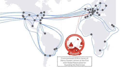 這條連接美國和法國的海纜,全長6400公里,谷歌完全私有,預計將于2020年第三季度投入使用,傳輸速度可達250Tbit/s。谷歌在其Google Cloud博客中透露,Dunant將成為首條擁有12對光纖,并采用SDM設計的海纜,而不是傳統(tǒng)海纜中的6對或8對,同時還將引入功率優(yōu)化的中繼器設計。