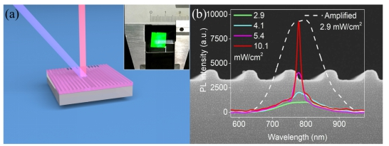 (a) DFB全硅激光器的光泵浦和發(fā)光示意圖;插圖:DFB激光器件的實物照片。(b)樣品的PL譜隨泵浦功率的變化;背景:DFB結(jié)構(gòu)的橫截面SEM圖像。