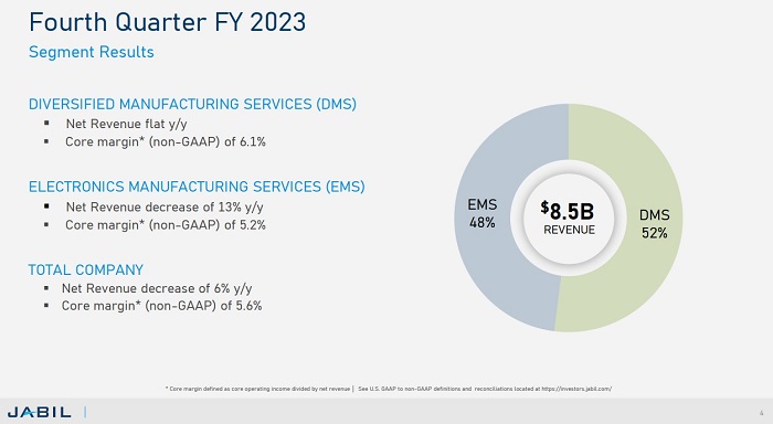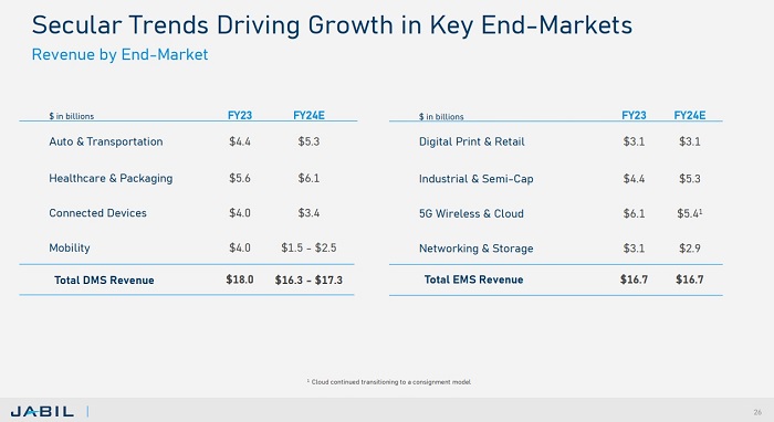 Jabil是一家提供綜合設(shè)計(jì)、制造、供應(yīng)鏈和產(chǎn)品管理服務(wù)的制造解決方案供應(yīng)商。在全球擁有100家廠區(qū)和20多萬(wàn)名員工。截至2023年8月31日的2023財(cái)年,Jabil年?duì)I收為347億美元,其中約52%來(lái)自多樣化制造服務(wù)(DMS),48%來(lái)自電子制造服務(wù)(EMS)。