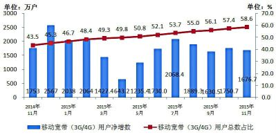 圖2 2014年~2015年11月移動(dòng)寬帶用戶當(dāng)月凈增數(shù)和總數(shù)占比情況