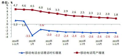 圖5 2014年~2015年11月移動(dòng)電話通話量和移動(dòng)電話用戶同比增長(zhǎng)比較