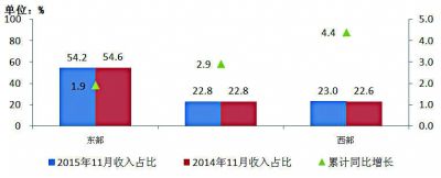 圖10 2015年11月東、中、西部電信主營(yíng)業(yè)務(wù)收入同期比較